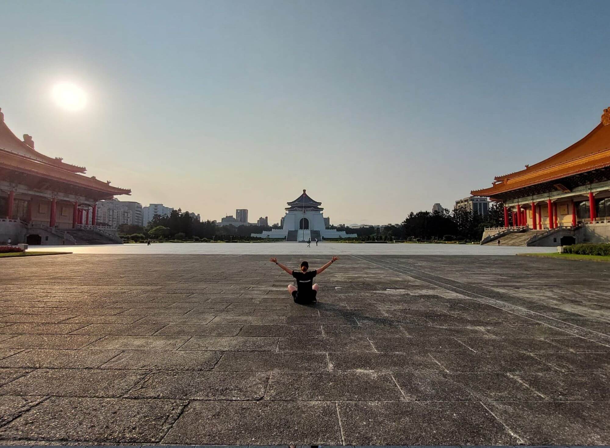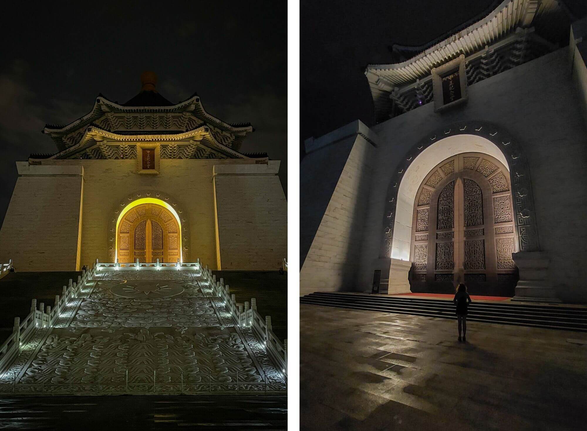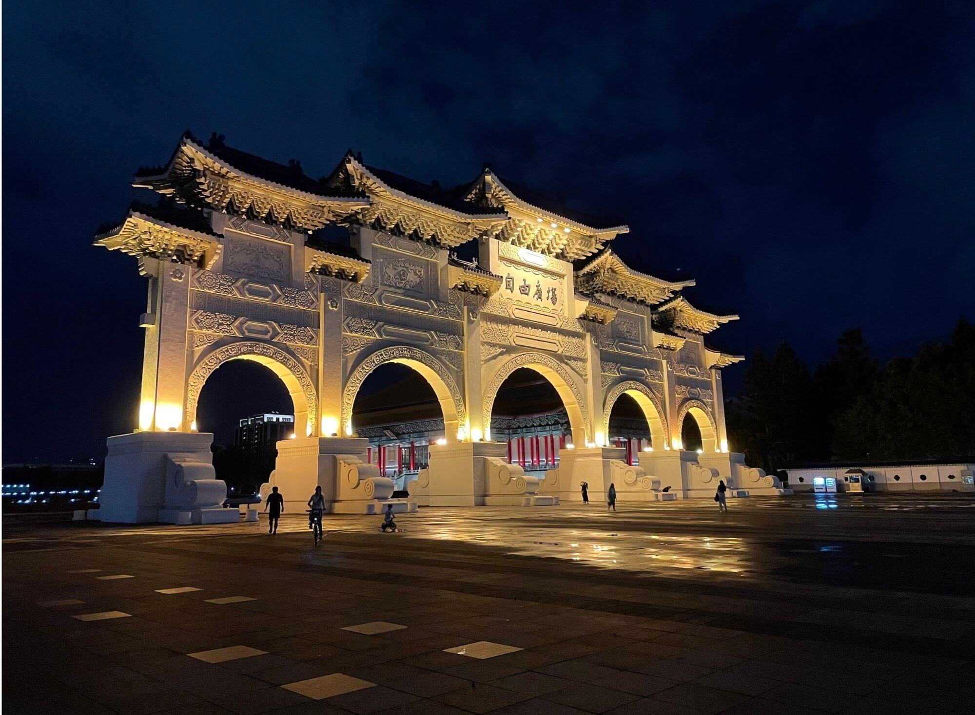 No i co tu dużo mówić, takie późno-wieczorne zwiedzanie, gdy na zewnątrz przyjemne ciepło, deszcz się zlitował i odpuścił, a po drodze udało się znaleźć wyśmienitą wegańską knajpkę z przepysznym i tanim jedzeniem, jest jak wiatr w żagle po nieudanym początku. Wiedziałam, że wpływy chińskie owocują monumentalnymi budowlami i faktycznie znajdująca się na tyłach Placu Wolności – Chiang Kai-shek Memorial Hall robi wrażenie. Na tyle, że postanawiamy tam pobiec o świcie dnia następnego, tym bardziej, że słońce wreszcie wypełzło spod ciężkiej pierzyny chmur.