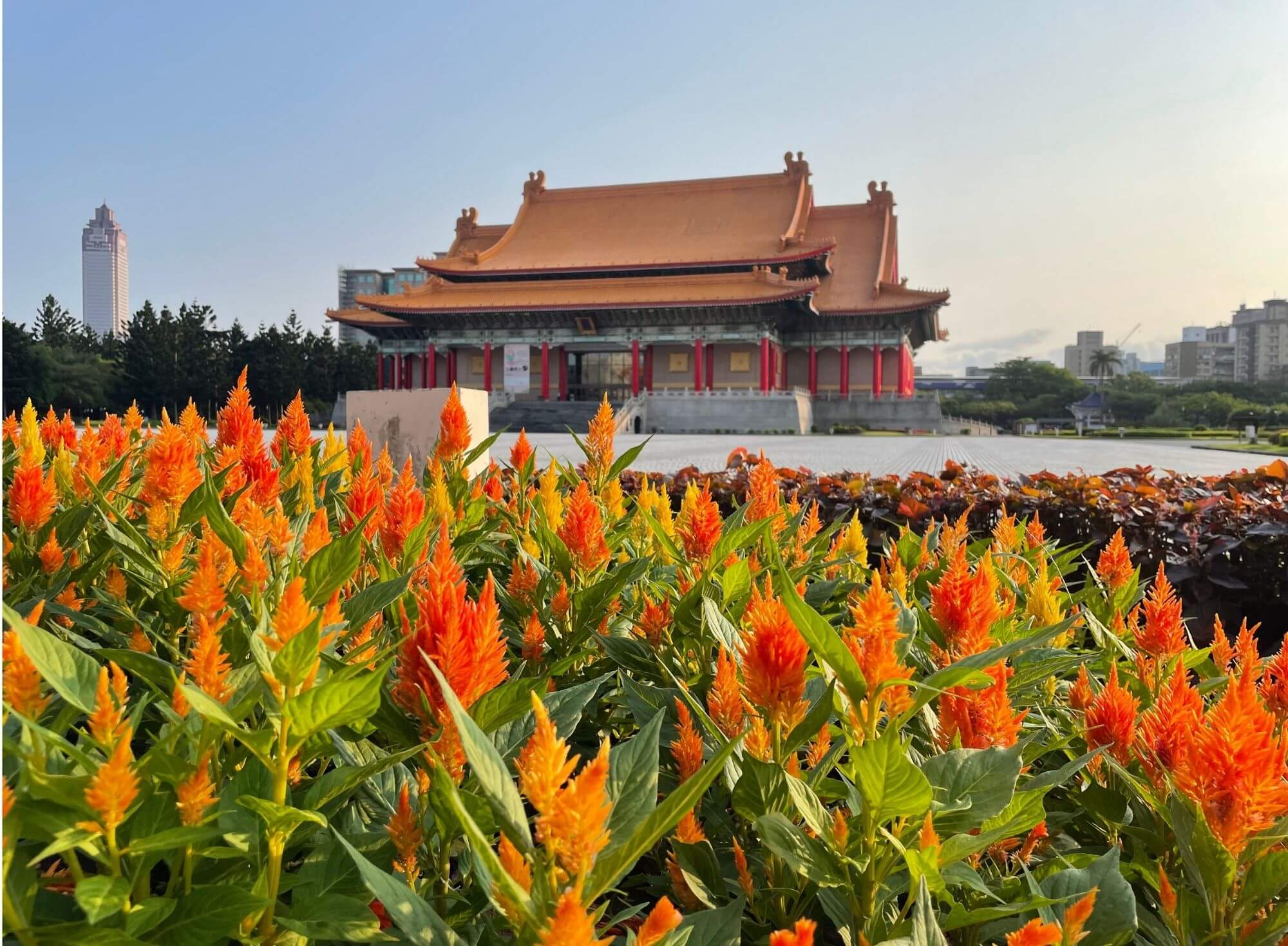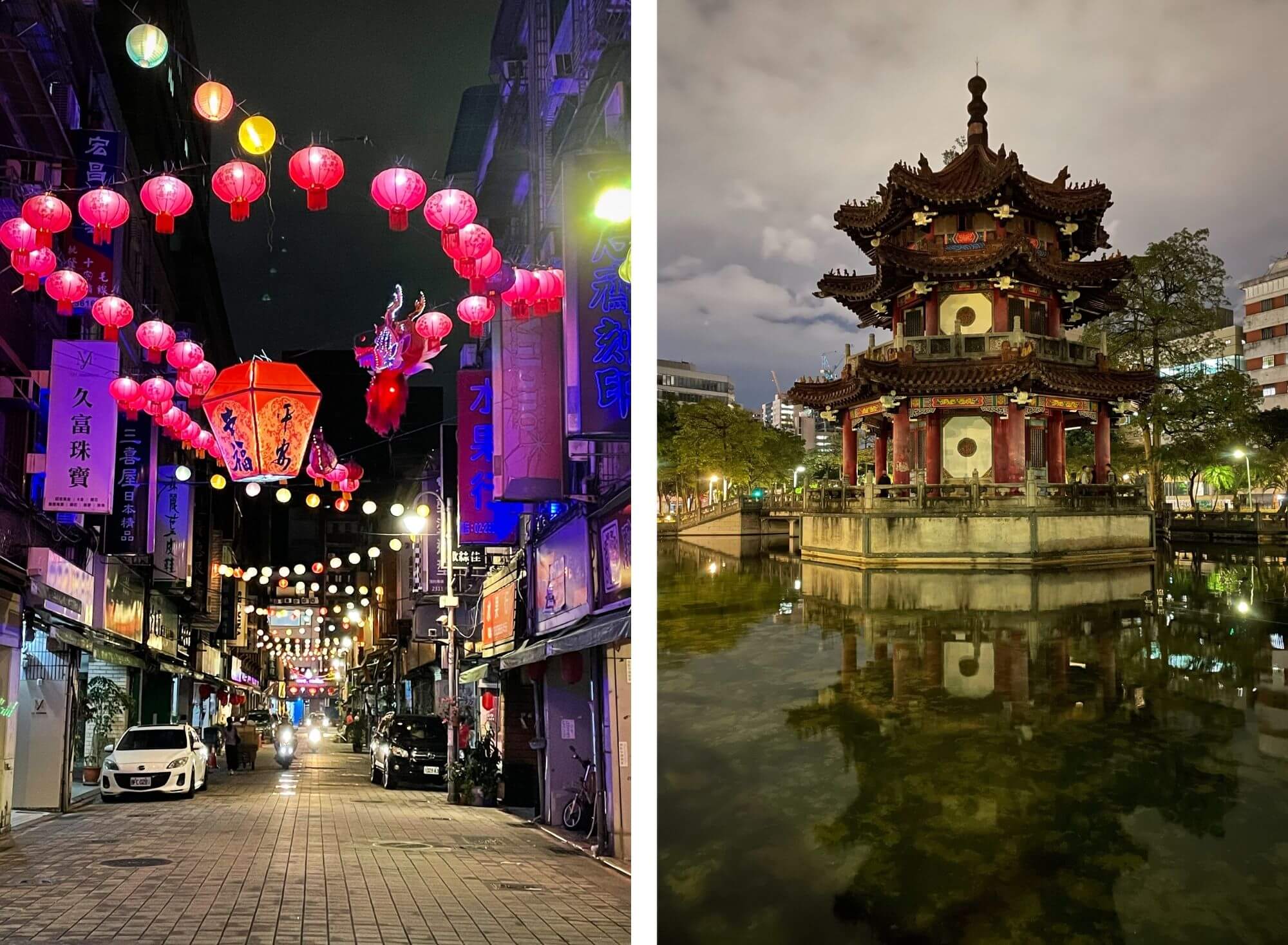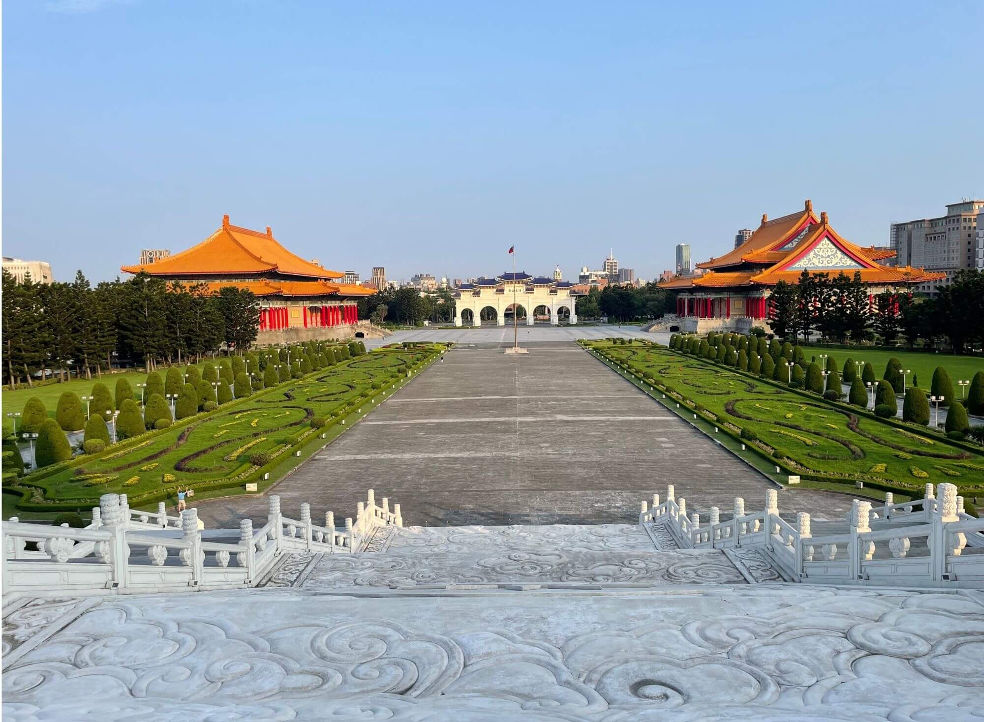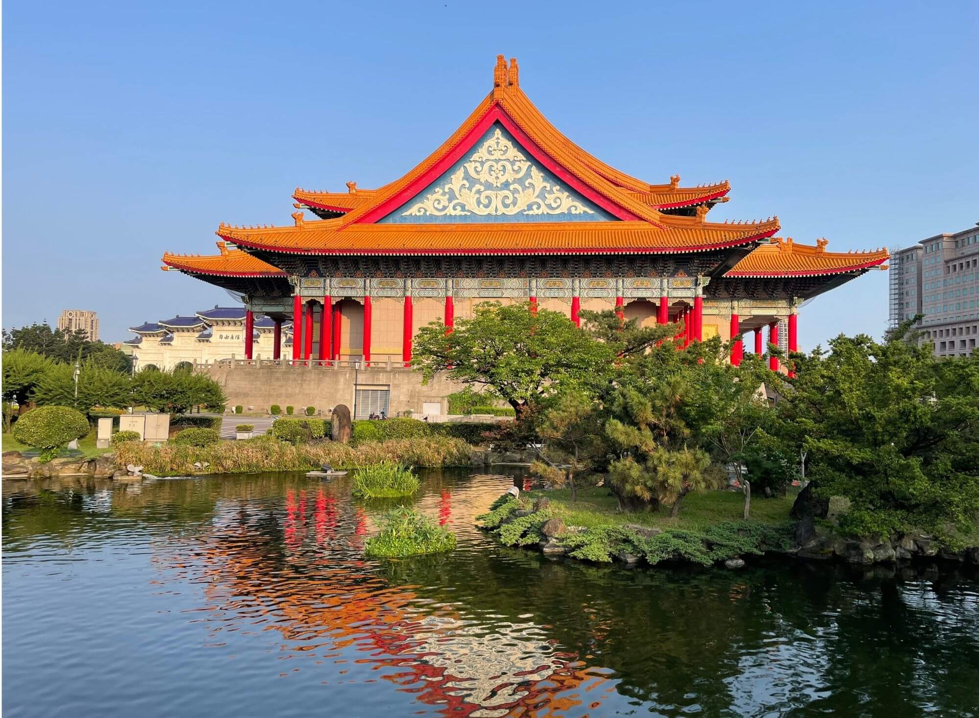 No i co tu dużo mówić, takie późno-wieczorne zwiedzanie, gdy na zewnątrz przyjemne ciepło, deszcz się zlitował i odpuścił, a po drodze udało się znaleźć wyśmienitą wegańską knajpkę z przepysznym i tanim jedzeniem, jest jak wiatr w żagle po nieudanym początku. Wiedziałam, że wpływy chińskie owocują monumentalnymi budowlami i faktycznie znajdująca się na tyłach Placu Wolności – Chiang Kai-shek Memorial Hall robi wrażenie. Na tyle, że postanawiamy tam pobiec o świcie dnia następnego, tym bardziej, że słońce wreszcie wypełzło spod ciężkiej pierzyny chmur.