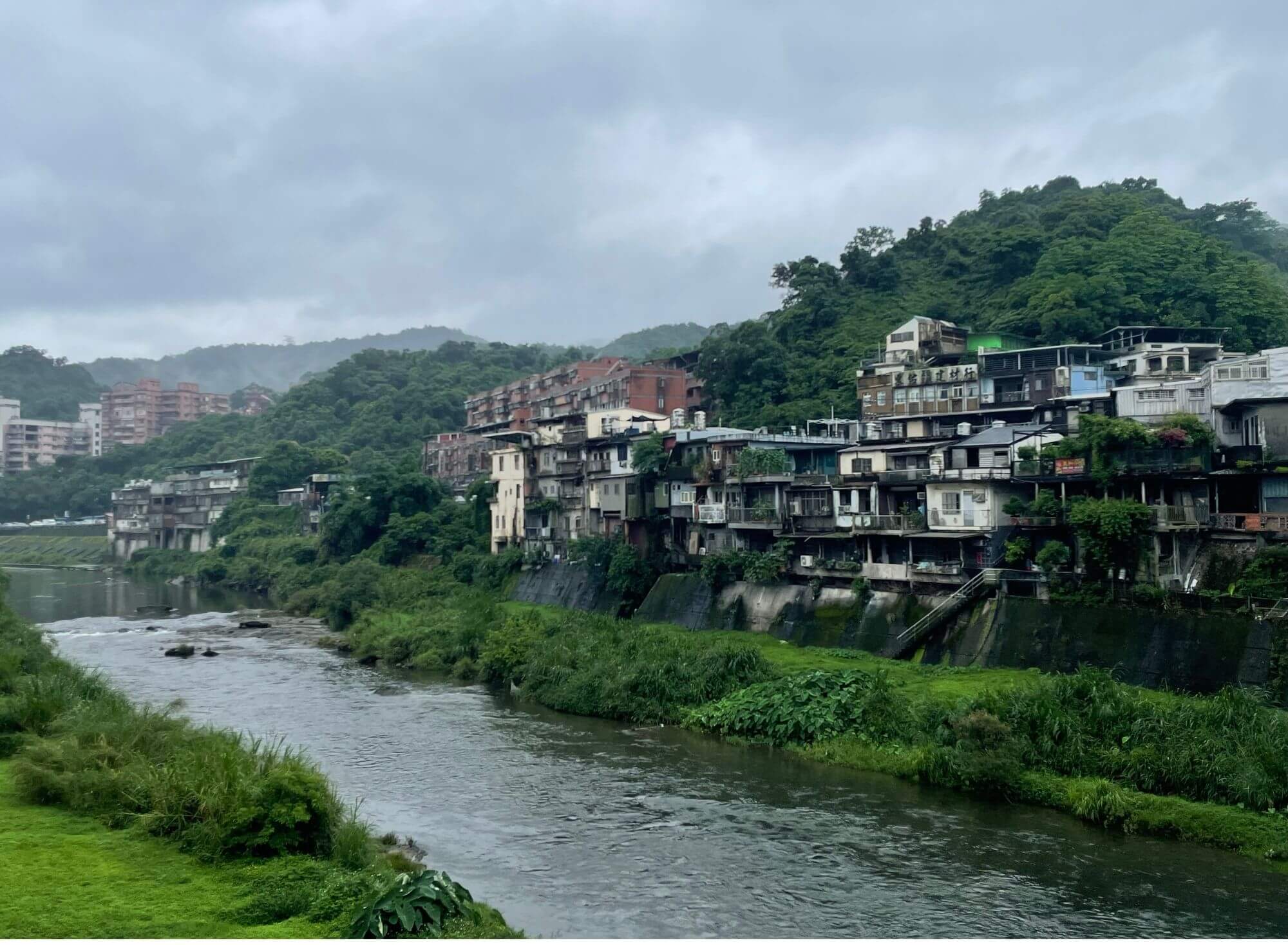 Tajwańska sieć kolejowa działa całkiem sprawnie i według mnie jest jednym z lepszych środków transportu gdy chcemy przemieścić się w nieco dalsze zakątki na wyspie. My, nie mogąc “wypłynąć na głębokie wody” i ruszyć w górskie Taroko postanowiliśmy wsiąść w pociąg podmiejski i dotrzeć do Shifen – głównie po to aby uciec od miejskiego zgiełku na rzecz bujnej przyrody. Ćwiczenie to wymagało jednej przesiadki i 50-minutowego postoju w totalnym wygwizdowie, jakim okazało się być Ruifang – nie działo się tam absolutnie nic ale i tak warto było zrobić sobie spacer w mżącym deszczu wzdłuż smrodliwego potoku, po to aby zobaczyć jak życie płynie poza ogniskami turystycznego amoku, którego mieliśmy doświadczyć już wkrótce. Gdy po tej niemal godzinie przymusowego postoju, załapaliśmy kolejny pociąg, ludzi nagle jakby się namnożyło i dotarło do nas, że wszyscy oni jadą w jednym kierunku – o zgrozo tym samym co my…